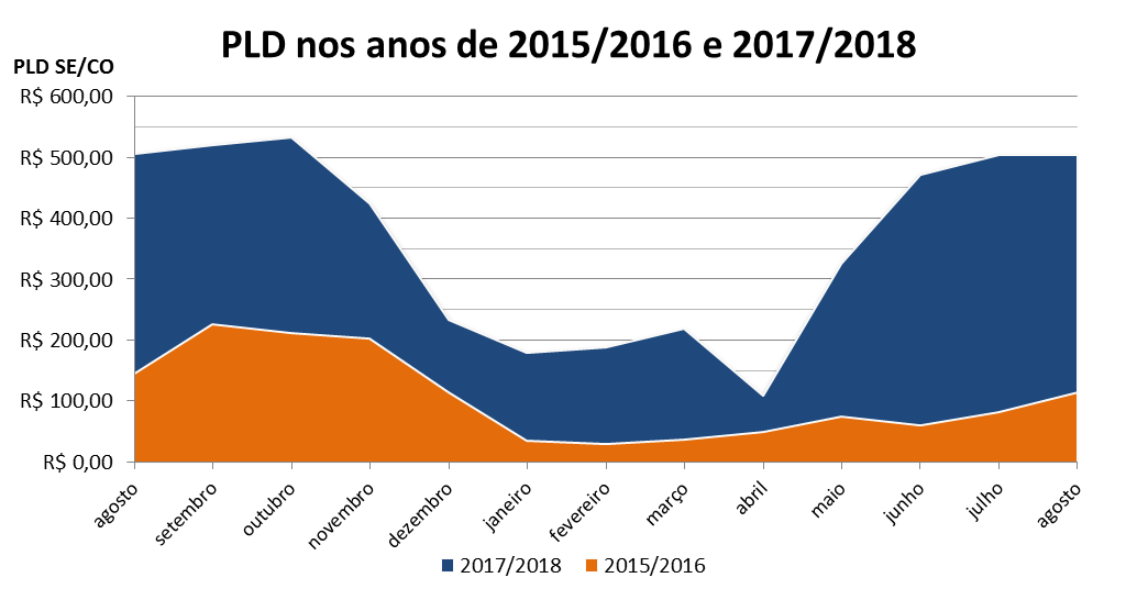 Considerando todos estes itens, é fato que encontrar o ponto de equilíbrio no mercado não tem sido tarefa fácil para os agentes, visto que, qualquer novo fator que influencia diretamente na formação do preço, é rapidamente assimilado pelos mesmos. Em um ambiente no qual a energia elétrica é um insumo essencial para o processo produtivo, toda economia deve ser buscada utilizando premissas de projeção de preços e riscos associados, avaliando ainda diversos pontos na hora de desenhar a estratégia de contratação. Para exemplificar dois períodos úmidos com características distintas, separamos um gráfico abaixo que representa o PLD SE/CO ao longo dos anos de 2015-2016 (laranja) e 2017-2018 (azul).