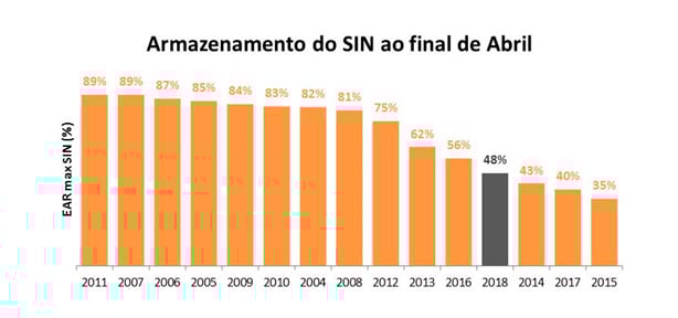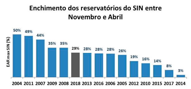 Mesmo com uma recuperação próxima a média, a previsão é de que os reservatórios encerrarão o mês de abril/18 próximos aos 48%. Ainda estaremos significativamente abaixo da média de 69% e entre os piores dos últimos 15 anos. Porém, 8% acima de 2017. O principal motivo para a situação atual é que os enchimentos nos anos 2014, 2015 e 2017 foram muito pequenos, o que gerou um ponto de partida baixo para o final novembro/17. Assim, já começamos o período úmido atual “devendo”.