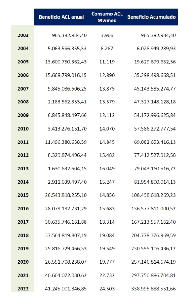 O mercado livre de energia proporcionou um patamar anual recorde de R$ 41 bilhões de economia nos gastos com energia elétrica. Esse resultado foi impulsionado por um consumo médio mensal de 24.503 MW médios pelos consumidores livres. Incluindo esse volume de consumo em 2022, o mercado livre de energia levou a ganhos acumulados de R$ 339 bilhões aos consumidores no ACL nos últimos 20 anos.