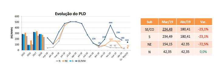 [:pb]No mês de abr/19, o Preço de Liquidação das Diferenças (PLD) sofreu redução em todos os submercados e foi fixado em R$ 180,41/MWh para os submercados SE/CO e S, R$ 42,35/MWh para os submercados NE e N. Em relação ao mês anterior, a redução nos submercados SE/CO e S foi de 23,1% ou R$ 54,08/MWh, no submercado NE a redução foi de 72,5% ou R$ 111,80/MWh e para o N o PLD se manteve no valor mínimo de R$ 42,35/MWh. A queda dos PLDs nos submercados SE e S se deve aos registros de vazões dos rios próximas á média histórica para esse período do ano durante todo o mês. Já a queda do PLD do submercado NE se deve principalmente, ao aumento da geração de pequenas usinas (solar e eólica) que atendem parte da carga desse subsistema.