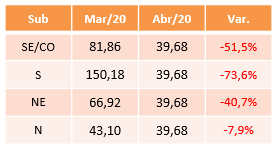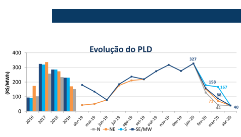 No mês de abril de 2020, o Preço de Liquidação das Diferenças (PLD) atingiu o valor mínimo de R$ 39,68/MWh para todos os submercados.