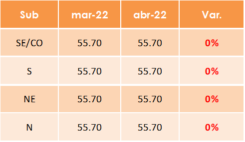 Os preços permaneceram no valor mínimo de R$55,70 para todos os submercados.