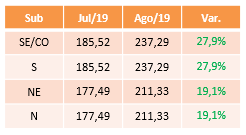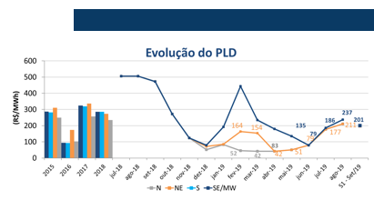 No mês de ago/19, o Preço de Liquidação das Diferenças (PLD) fechou em R$ 237,29/MWh para os submercados SE/CO e S, já os submercados NE e N fecharam em R$ 211,33/MWh.