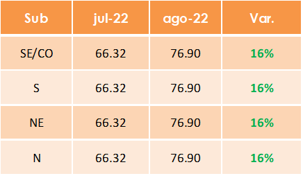 Nesse mês a média diária do Preço de Liquidação das Diferenças (PLD) apresentou um aumento de aproximadamente 16% em relação ao mês anterior.