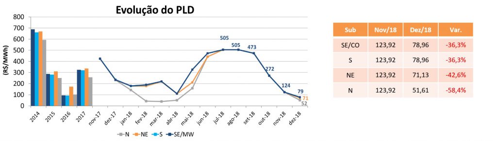 [:pb]No mês de Dez/18, o Preço de Liquidação das Diferenças (PLD) sofreu redução em todos os submercados e foi fixado em R$ 78,96/MWh para os submercados SE/CO e S, R$ 71,13/MWh para o NE e R$ 51,61/MWh para o N. Em relação ao mês anterior, a queda nos submercados SE/CO e S foi de 36,3% ou R$ 44,96/MWh. No submercado NE, a redução foi de 42,6% ou R$ 52,79/MWh e para o N a variação foi de 58,4% ou R$ 72,31/MWh. A queda dos PLDs se deve principalmente, aos maiores índices de precipitações em bacias importantes para o Sistema Interligado Nacional (SIN) no início do mês de dezembro. Este cenário proporcionou estimativas de afluências favoráveis, próximas à média histórica para esse período do ano.