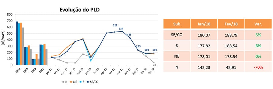 No mês de fev/18, o Preço de Liquidação das Diferenças (PLD) dos submercados SE/CO, S e NE sofreram alta e foram fixados em R$ 188,79/MWh para o SE/CO, 188,54/MWh para o S e R$ 178,54/MWh para o NE. Quando comparado com o mês anterior houve uma alta de aproximadamente 5% para os submercados SE/CO e S, o submercado NE sofreu um ligeiro aumento de 0,3%. já o submercado Norte sofreu uma queda de aproximadamente 70% e foi fixado em R$ 42,91/MWh. Os preços do SE/CO e do S tiveram um leve aumento devido ao cenário de afluências ruim verificado durante o mês de fev/18. O descolamento observado no submercado N é devido ao excedente energético existente nessa região.