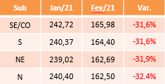 Destaca-se que durante o mês de Fevereiro o nível de armazenamento da região Norte quando comparando com o mês de janeiro, apresentou uma variação de 21,2%.