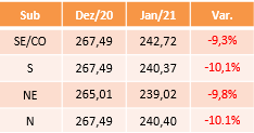 Em relação ao mês anterior, houve redução de 9,3% para o submercado SE, 9,8% para o Nordeste e 10,1% para o Sul e Norte.