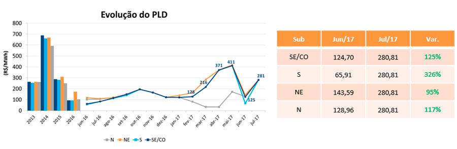 No mês de Jul/17, os preços de todos submercados sofreram uma elevação e foram fixados em R$ 280,81/MWh, o que significa um aumento de 125% para o SE/CO, 326% para o Sul, 95%, no Nordeste e 117% no Norte, se comparados aos preços do mês anterior. Este aumento dos preços de todos submercados ocorreu, principalmente, pela estiagem observada ao longo de Jul/17 nas principais bacias do País.