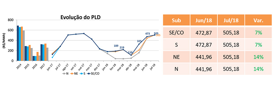 No mês de Jul/18, o Preço de Liquidação das Diferenças (PLD) sofreu aumento e foram fixados no preço máximo de R$ 505,18/MWh em todos os submercados. Quando comparado com o mês anterior houve uma elevação de aproximadamente 7% para os submercados SE/CO e S, 14% para o NE e N. Destaca-se que este é o primeiro mês do ano em que a média mensal foi fixada no valor máximo. A elevação no PLD se deve, principalmente, ao cenário de vazões desfavoráveis e a redução dos volumes de armazenamento ocorridos durante o mês.