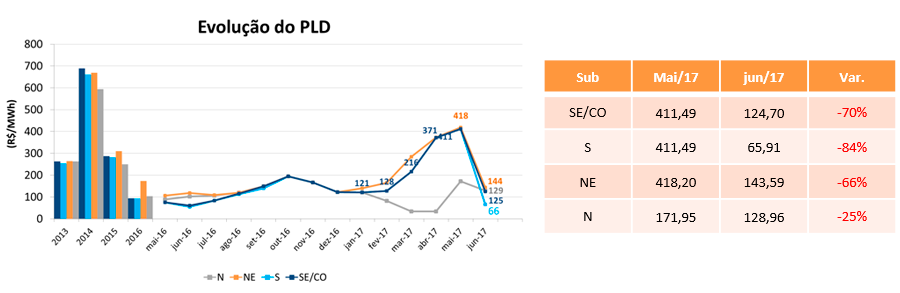 No mês de Jun/17, o preço do Sudeste/Centro-oeste sofreu uma redução de 70% ante ao mês anterior e fechou em R$ 124,70/MWh. Os preços médios do Sul, Nordeste e o Norte foram fixados em R$ 65,91/MWh, R$ 143,59/MWh e R$ 128,96/MWh, que representa uma queda ante Mai/17 de 84%, 66% e 25%, respectivamente. Essa redução dos preços de todos submercados ocorreu, principalmente, pelo alto volume das chuvas realizadas ao longo de Jun/17 nas bacias do Sul e Sudeste do país.