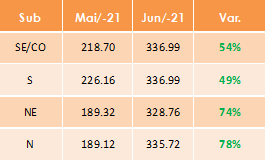 A média para o mês de junho ficou em R$ 336.99/MWh para os submercados SE/CO e Sul; R$ 328.76/MWh para o NE e R$ 335.72/MWh para o Norte.