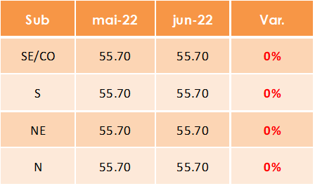 Os preços permaneceram no valor mínimo de R$55,70 para todos os submercados.