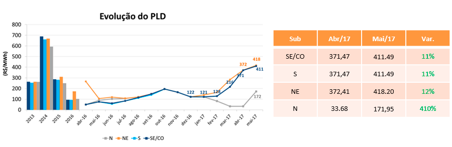 No mês de Mai/17, os preços do Sudeste/Centro-oeste e Sul sofreram um aumento de 11% ante ao mês anterior e fecharam em R$ 411,49/MWh. Os preços médios do Nordeste e o Norte foram fixados em R$ 418,20/MWh e R$ 171,95/MWh, o que representa um aumento ante Abr/17 de 12% e 410%, respectivamente. Esse aumento dos preços do Sudeste, Sul e NE ocorreu, principalmente, pela situação desfavorável das chuvas verificadas ao longo de Mai/17, com exceção dos últimos dias do mês, nos quais ocorreram altos volumes de chuvas. Além disso, a alteração dos parâmetros do CVaR contribuiu para o aumento do patamar de preços se comparado a Abr/17. Já no Norte, os preços aumentaram devido à redução das chuvas no submercado.