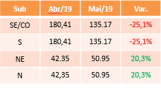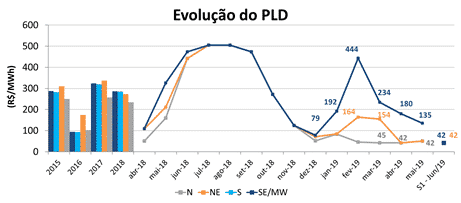 No mês de Mai/19, o Preço de Liquidação das Diferenças (PLD) sofreu redução nos submercados SE/CO e S e foi fixado em R$ 135,17/MWh. Para os submercados NE e N, houve pequena elevação e fechou em R$ 50,95/MWh.