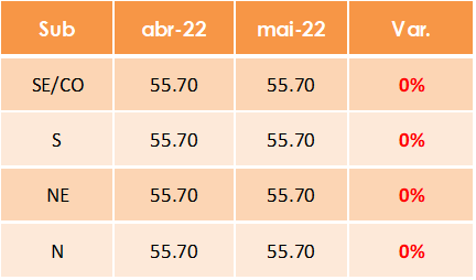 Os preços permaneceram no valor mínimo de R$55,70 para todos os submercados.