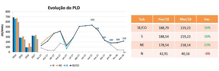 No mês de mar/18, o Preço de Liquidação das Diferenças (PLD) dos submercados SE/CO, S e NE sofreram alta e foram fixados em R$ 219,23/MWh para o SE/CO e o S, e R$ 218,14/MWh para o NE. Quando comparado com o mês anterior, houve uma alta de aproximadamente 16% para os submercados SE/CO e S, enquanto o submercado NE sofreu um aumento de aproximadamente 22%. Já o submercado Norte sofreu uma queda de aproximadamente 6% e foi fixado no preço mínimo de R$ 40,16/MWh. Com exceção do Norte, em todos os submercados, o aumento dos preços aconteceu, principalmente, em função dos cenários de afluências desfavorável ao longo do mês. O descolamento observado no submercado N ocorreu devido ao excedente energético verificado no decorrer do mês de Mar/18.