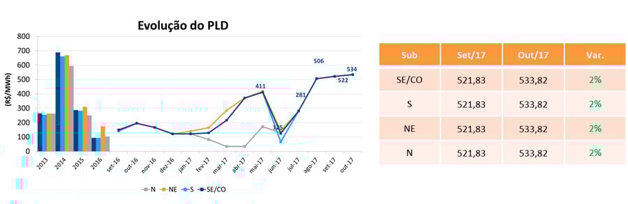 No mês de Out/17, o Preço de Liquidação das Diferenças (PLD) de todos os submercados sofreu elevação e foi fixado no valor máximo de R$ 533,82/MWh. Quando comparado com o mês anterior houve um aumento de 2% para todos os submercados. A manutenção dos preços em patamares elevados deve-se, principalmente, ao comportamento das chuvas abaixo do esperado em todas as bacias importantes do País.