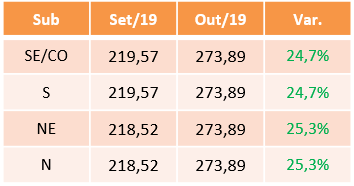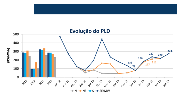 No mês de outubro/19, o Preço de Liquidação das Diferenças (PLD) fechou em R$ 273,89/MWh para todos submercados.