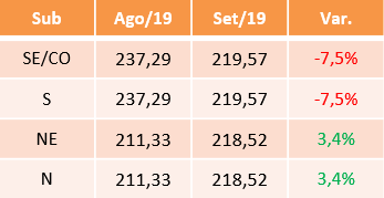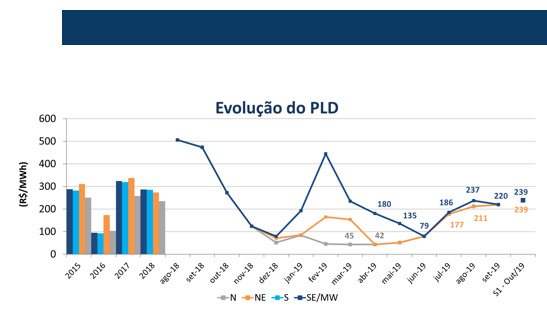 No mês de set/19, o Preço de Liquidação das Diferenças (PLD) fechou em R$ 219,57/MWh para os submercados SE/CO e S, já os submercados NE e N fecharam em R$ 218,52/MWh.
