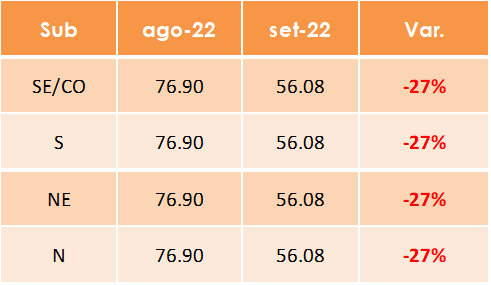 Um dos principais motivos para a redução nos preços foi o aumento nos volumes de chuva, principalmente nos Submercados Sul e SE durante o mês de setembro.