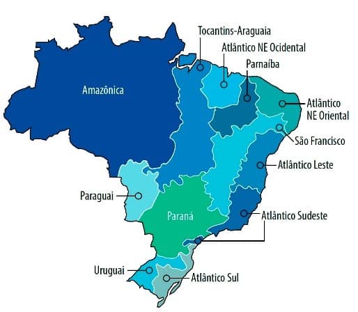 As dimensões continentais do território brasileiro apresentam características distintas de relevo, condições de solo e regime de chuvas entre cada região. De acordo com a Agência Nacional de Águas (ANA), no Brasil, existem mais de 9000 rios que estão distribuídos em 12 principais regiões hidrográficas.