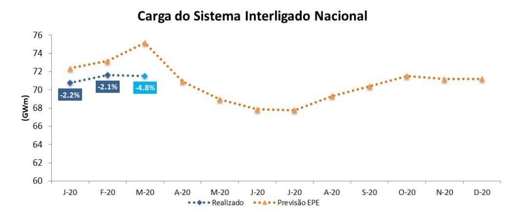 Para o setor elétrico, o desempenho e a expectativa econômica têm relação direta com a projeção da carga, que será atendida pelo Sistema Interligado Nacional. Analisando os dados oficiais do primeiro bimestre do ano, período no qual ainda não tínhamos a disseminação constatada do vírus, a carga realizada já estava abaixo do previsto. Espera-se para os próximos meses um distanciamento ainda maior da estimativa original da Empresa de Pesquisa Energética, EPE. Para março, o desvio esperado é de 4,8%, conforme podemos ver no gráfico a seguir: