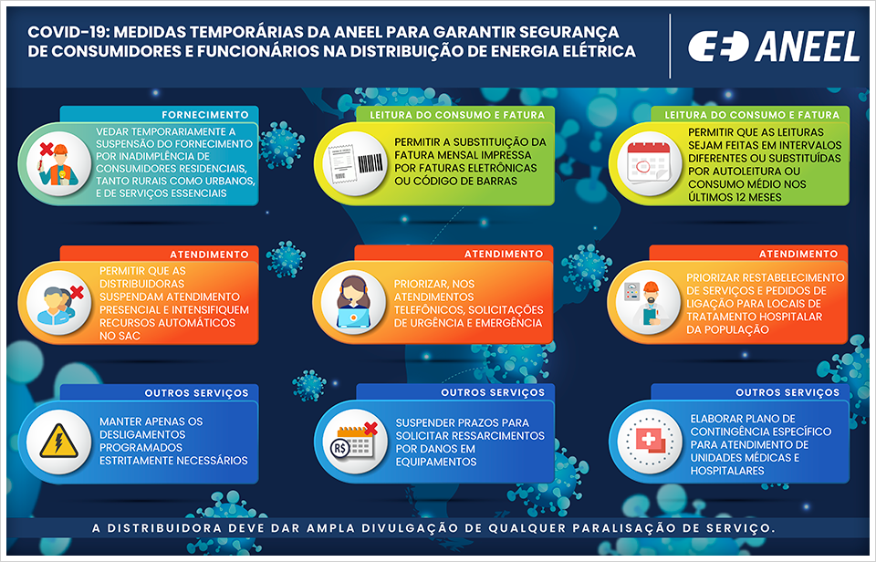 A diretoria da ANEEL aprovou no final de Março, em Reunião Pública Extraordinária, conjunto de medidas para garantir a continuidade do serviço de distribuição de energia elétrica, protegendo consumidores e funcionários das concessionárias em meio ao cenário de pandemia do novo coronavírus.