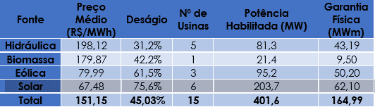 Destinado à contratação de energia proveniente de novos empreendimentos de fontes hidrelétrica, eólica, solar fotovoltaica e termelétrica a biomassa, com início do suprimento a partir de janeiro de 2023, o certame contratou 401,6 MW de potência e teve preço médio de R$ 151,15 por MWh. O deságio médio em relação aos preços-teto estabelecidos, de 45,03%, representa uma economia de R$ 2,166 bilhões para os consumidores de energia.