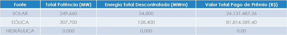 No dia 28 de agosto de 2017, a Câmara de Comercialização de Energia Elétrica – CCEE realizou o primeiro Mecanismo de Descontratação de Energia de Reserva, uma oportunidade para as empresas que deveriam implantar empreendimentos de geração, optarem por encerrar sua obrigação, tendo em vista que suas usinas não apresentam viabilidade econômica. Para ter a possibilidade de descontratar a energia vendida em um leilão de energia de reserva o empreendedor deve pagar um prêmio. Como resultado foram descontratados 16 empreendimentos eólicos e 9 solares, totalizando R$105,9 milhões em pagamento de prêmio e 183,2MWm de energia descontratada. Importante destacar que todos os empreendimentos vencedores do mecanismo competitivo, já não compunham a formação de preço futuro, dado seu estágio de atraso nas obras e inviabilidade apontada para o regulador, não impactando, portanto, as projeções de PLD. O resultado da descontratação por fonte segue na tabela abaixo: