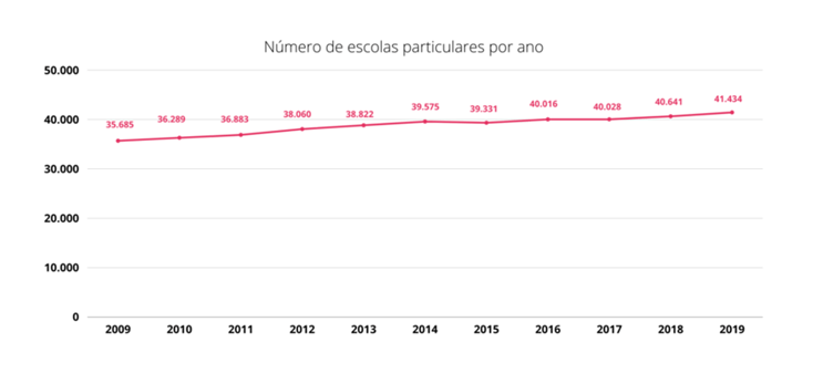 Justamente com esse contexto, ainda se tem um gráfico do aumento do número de escolas particulares. Ou seja, a concorrência está se ampliando. Veja a seguir: