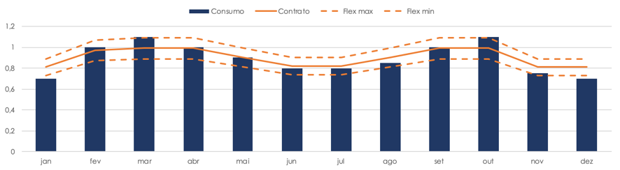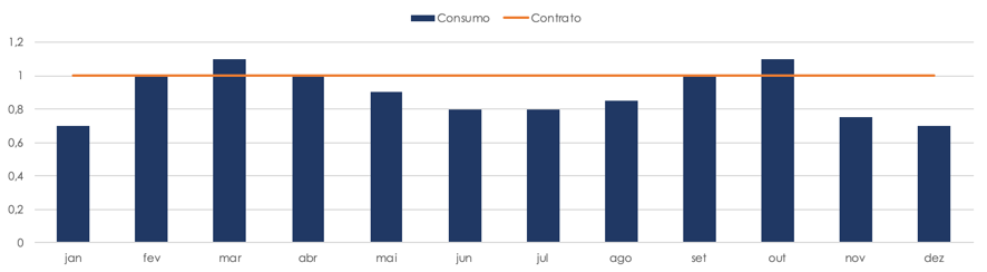 De acordo com este número, é possível criar um planejamento de consumo. Nos casos em que possuímos uma previsão de produção, pode-se aplicar a estratégia de sazonalização da melhor forma possível. Com esta produção podemos otimizar a contratação de energia, a fim de economizar no valor total do contrato. Nos dois gráficos abaixo podemos observar um exemplo no qual é possível reduzir um contrato de 1MWm para 0,9MWm.