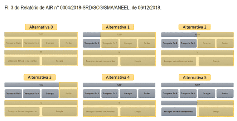 Alternativa 5, pior cenário para o consumidor, permitiria a compensação dos créditos apenas sobre a componente de energia da TE; Existem ainda outras 4 alternativas intermediárias, conforme figura. Seguindo na avaliação das mudanças, a ANEEL lançou a