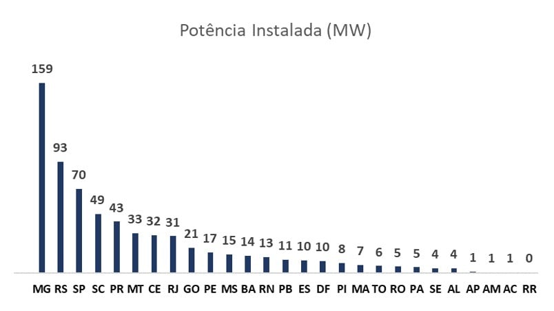 Primeiramente, observa-se Minas Gerais com um grande destaque de 159MW, representando quase 25% de toda a potência instalada em GD, seguida pelo Rio Grande do Sul com 93MW (14%) e por São Paulo com 70MW (pouco mais de 10% de toda a potência instalada de GD).E quais são algumas das variáveis que podem impactar a evolução da GD e a diferenciação de cenários de um Estado para outro?
