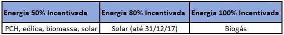 A regulamentação desta energia se deu pelo Artigo n.º 26 da Lei nº 9.427/1996 e pode ser resumida no quadro abaixo: Energia 50% Incentivada Energia 80% Incentivada Energia 100% Incentivada PCH, eólica, biomassa, solar Solar (até 31/12/17) Biogás
