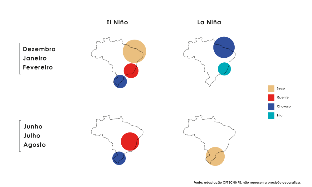 Essa mudança de temperatura na superfície do Oceano acorre de forma acoplada à mudança na circulação atmosférica e impacta no regime de chuvas do Brasil. Seus impactos dependem muito da intensidade e do período em que o fenômeno se instala. Nos meses de junho, julho e agosto, quando temos o El Niño, a região Sudeste/Centro-Oeste tende a registrar temperaturas maiores do que o normal, enquanto o Sul tende a registrar volumes de chuva acima da média. No entanto, quando temos uma La Niña, para o mesmo período do ano, há tendência de chuvas abaixo do normal na região Sul. Nos meses de dezembro, janeiro e fevereiro, o El Niño tende a aumentar as chuvas no Sul, elevar as temperaturas no Sudeste/Centro-Oeste e reduzir as chuvas do Nordeste. Já na La Niña, nesse mesmo período, as chuvas do Norte e parte do Nordeste tendem a aumentar, enquanto o Sudeste/Centro-Oeste tende a observar temperaturas abaixo do normal.